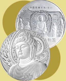 中国人民银行定于2002年4月10日发行中国石窟艺术-龙门石窟金银纪念币一套。该套纪念币共5枚,其中金币2枚,银币3枚,均为中华人民共和国法定货币。 1公斤纪念银币为精制币,含纯银1公斤,形状为圆形,直径100毫米,面额300元,成色99.9%,发行量8000枚。 (供稿:北京银协集币服务中心)