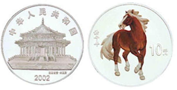 中国人民银行定于2001年10月26日发行2002中国壬午(马)年金银纪念币一套。该套纪念币共12枚,其中金币6枚,银币6枚,均为中华人民共和国法定货币。1盎司圆形彩色银币为精制币,含纯银1盎司,成色99.9%,直径40毫米,面额10元,发行量100000枚。(供稿:北京银协集币服务中心)