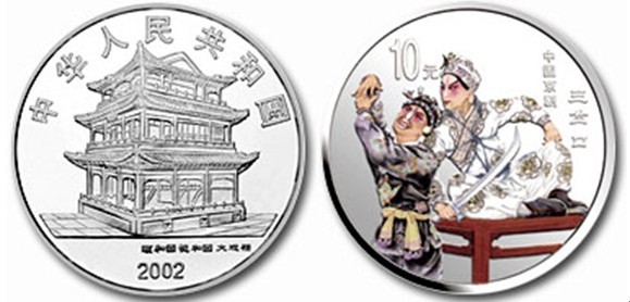 中国人民银行定于2002年12月5日发行中国京剧艺术彩色金银纪念币(第4组)一套。该套彩色金银纪念币共6枚,其中金币1枚,银币5枚,均为中华人民共和国法定货币。 一、彩色金银纪念币图案 (一)正面图案 该套彩色金银纪念币正面图案为颐和园德和园大戏楼,并刊国名、年号。 (二)背面图案 1盎司彩色银质纪念币(4枚)背面图案分别为京剧《三岔口》、《坐寨盗马》、《芦花荡》、《蒋干盗书》人物造型,并刊面额。 1盎司彩色银质纪念币(4枚)为精制币,各含纯银1盎司,形状圆形,直径40毫米,面额10元,成色99.9%,发行量均为38000枚。(供稿:北京银协集币服务中心)