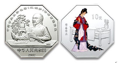 中国人民银行定于2002年9月3日发行中国古典文学名著《红楼梦》彩色金银纪念币(第二组)一套。该套纪念币共6枚,其中金币1枚,银币5枚,均为中华人民共和国法定货币。1盎司彩色纪念银币(4枚)背面图案分别为元春归省图、惜春作画图、熙凤弄权图、宝钗扑蝶图,并刊面额。 1盎司彩色纪念银币(4枚)为精制币,每枚含纯银1盎司,形状均为八边形,外接圆直径均为40毫米,面额均为10元,成色均为99.9%,发行量均为38000枚。(供稿:北京银协集币服务中心)